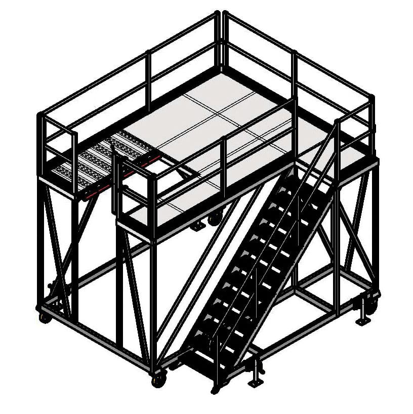 Built with durability and user safety as priorities, the stand features treadplate decking for strong grip under demanding hangar conditions. A secure sliding gate controls entry and exit at height, while 45° access stairs provide a natural ascent and descent angle to reduce fatigue during extended maintenance shifts.