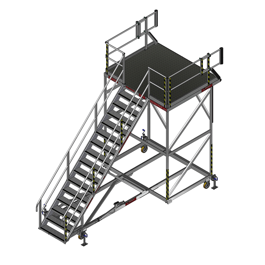 To accommodate varying aircraft heights and uneven ramp surfaces, the platform includes height adjustable jacks and retrofit jack mounts at the stair end for secure levelling and stabilization. A bolt-on grab rail improves safe handling, while reflective tape increases visibility during night operations and low-light conditions.