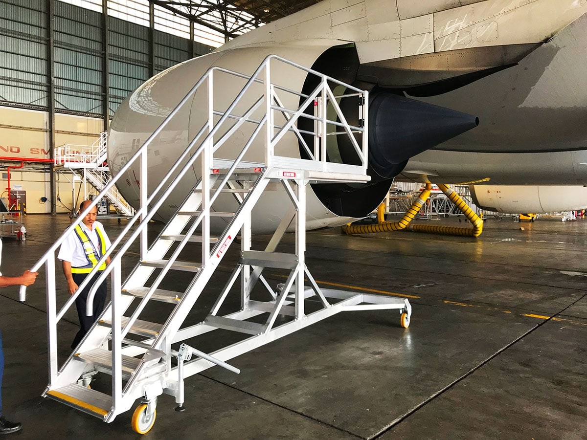 Unlike generic ladders or standard maintenance stairs, this platform is precision-built to cantilever directly into the engine nacelle. This unique design allows maintenance personnel to access the fan blades, the engine attrition lining, and other surrounding componentry with ease and ergonomic comfort. Considering the dimensions and height of the A350’s engines—a common feature of modern wide-body aircraft maintenance—traditional methods often require technicians to strain or overreach.