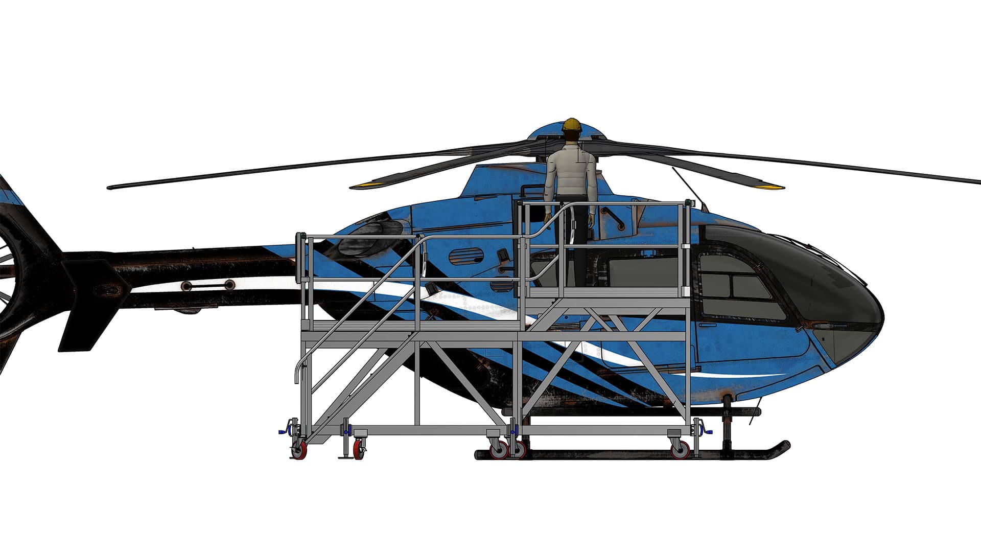 Tailored specifically for the Airbus H135, this platform system addresses the unique structural geometry of the helicopter, particularly the slope of the upper fuselage. Recognizing the need for varied heights, the system features two distinct levels integrated into the platform design. This crucial dual-level arrangement ensures ideal and safe positioning for technicians accessing both the top engine area and the higher rotor head. Achieving precise elevation at these two critical maintenance locations eliminates the need for precarious stretching or climbing. This dramatically reduces fall risk and enhances task completion speed and quality, focusing on our core value of Safety First. For alternative H135 access, consider the Airbus H135 Nose Access Platform.