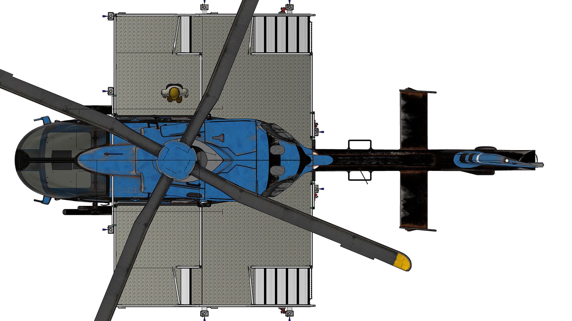 The platform’s physical design also includes a large side cantilever. This deliberate engineering feature is crucial for clearing the helicopter’s skids at ground level, allowing the platform to be positioned intimately close to the fuselage without interference, maximizing the usable work envelope. Innovative features include a protective foam lining. This feature safeguards the delicate surfaces of the Airbus H135, preventing accidental scratches or damage during docking and maintenance procedures. The platform is rated for a 500kg (1100lb) Safe Working Load (SWL), providing ample capacity for technicians, tools, and necessary spares. The H135 Side Access Docking Platform is designed to be highly versatile, available in three standard platform heights (0.95m, 1.7m, and 2.3m).