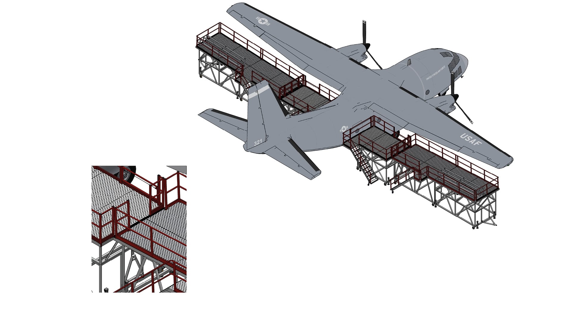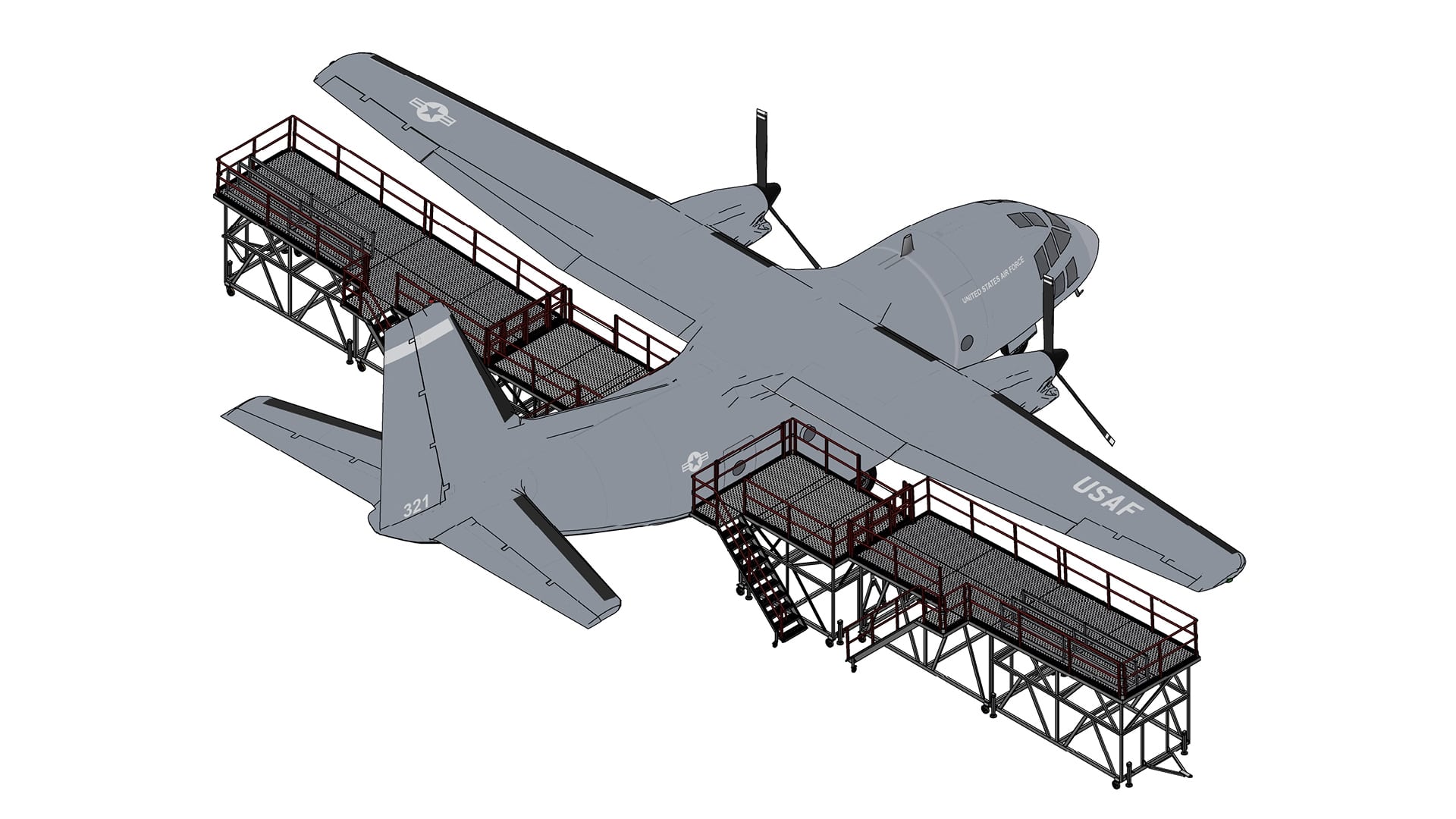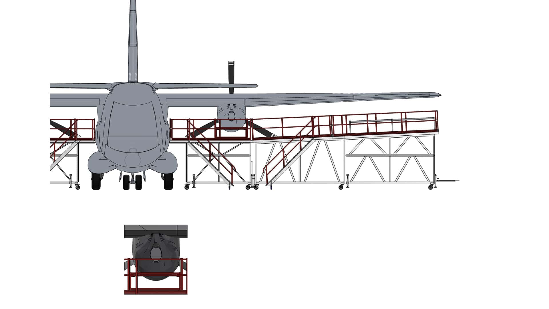 Alenia C-27J Flight Controls Wing Dock – A modular, towable wing dock system enabling safe and stable access to the rear wing flight controls on the C-27J, whether the aircraft is on or off jacks.
