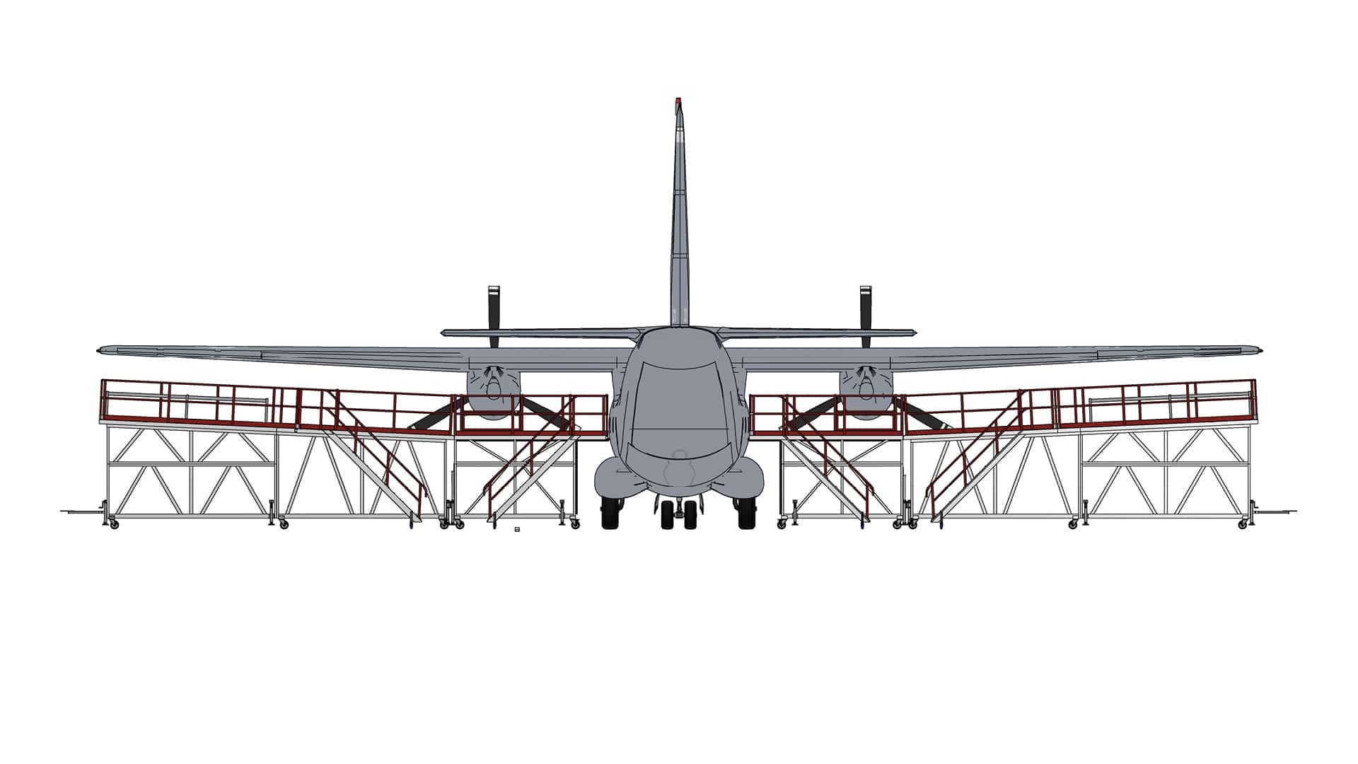 The Alenia C-27J Flight Controls Wing Dock is a modular, mobile access system designed to give technicians clear, stable reach to the flight-control surfaces located at the rear of the C-27J’s wing. Built for precision work on a tactical airlifter where flap assemblies, control linkages, actuators and structural interfaces must be serviced with accuracy, this dock provides a strong, steady and self-contained workspace that adapts to the aircraft’s position and loading conditions.