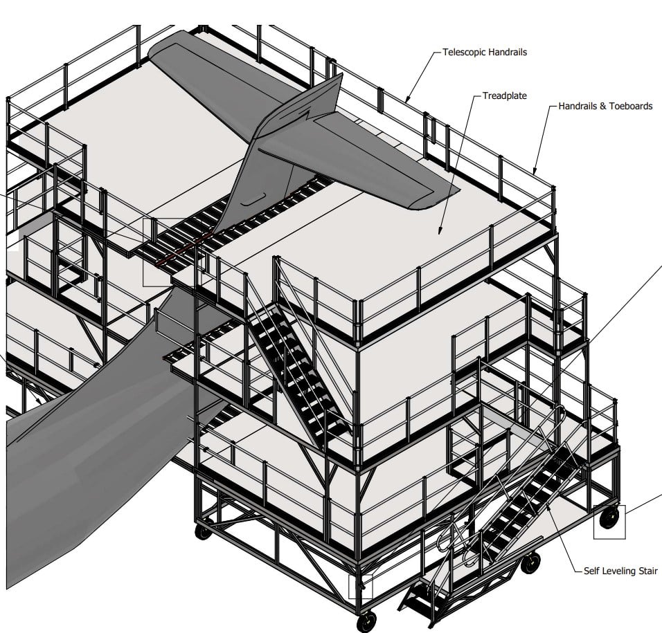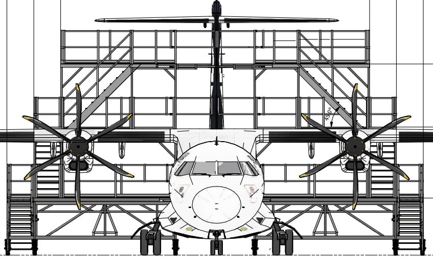 By dedicating this mobile access solution, the ATR 72 Tail Dock, to the difficult-to-reach T-tail structure, workflow around the airframe is optimized. The docking system’s purpose is to replace temporary or less secure methods of high-level access with a stable, ergonomic workspace. The integration of a towbar simplifies repositioning. This Adjustable Height Tail Docking System provides a secure, flexible, and highly efficient solution for all maintenance and inspection tasks required on the ATR 72 T-tail, ensuring paramount safety and operational uptime for this high-wing regional airliner.
