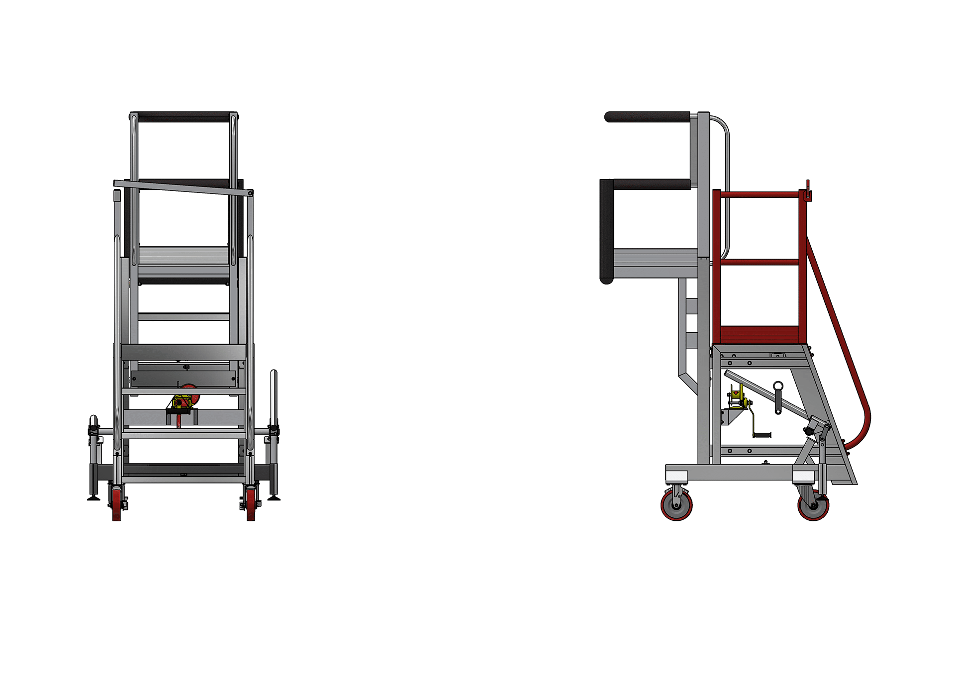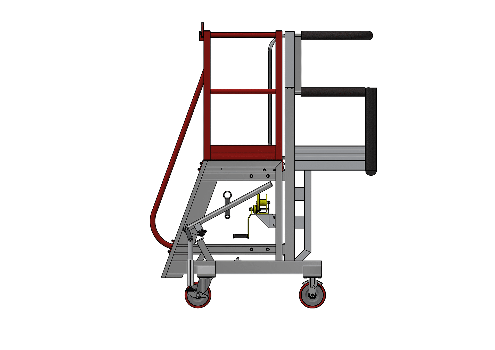 Adjustability is central to the platform’s utility. It features an adjustable cantilever section, crucial for accommodating varying aircraft dimensions and ensuring technicians can align the platform perfectly with the specific work area on the tail. A convenient hand winch mechanism is integrated for the smooth and precise raising and lowering of this cantilever section, allowing for swift adaptation to suit the stages of any maintenance application. This adjustable height capability ensures the Hawk Tail Access Stand can be optimized for differing maintenance requirements and tasks across the entire aft airframe.