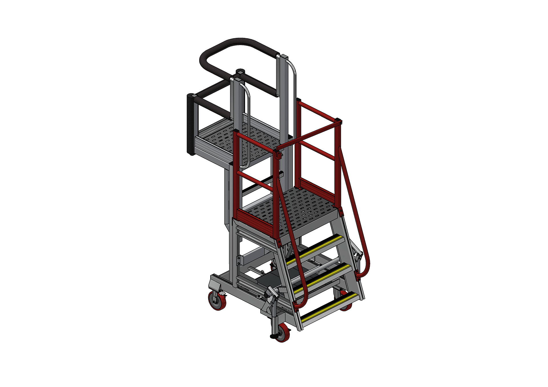 Access to the platform is provided via a 70° ladder, designed for safe and efficient ascent and descent. The ladder features anti-slip nosing on the steps, providing dependable traction in a busy hangar environment. The deck itself utilizes perforated decking, which aids in drainage, minimizes weight, and maintains a slip-resistant surface, enhancing overall worker safety. Safety and aircraft protection are prioritized with the inclusion of protective foam strategically placed on all aircraft contact points. This feature ensures that the stand can be maneuvered and positioned firmly against the airframe without scratching or damaging the aircraft skin.
