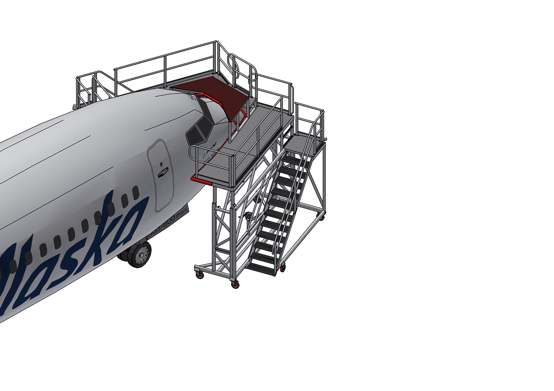 We deliver specialized, heavy-duty access for the Boeing B737 nose section. This two-part platform set is an indispensable asset for aircraft maintenance, providing superior and safe access to the windshield and radome areas. Designed with precision, this modular platform integrates seamlessly with the B737 profile, ensuring technicians have unobstructed and ergonomic access for inspection, repair, and routine servicing.