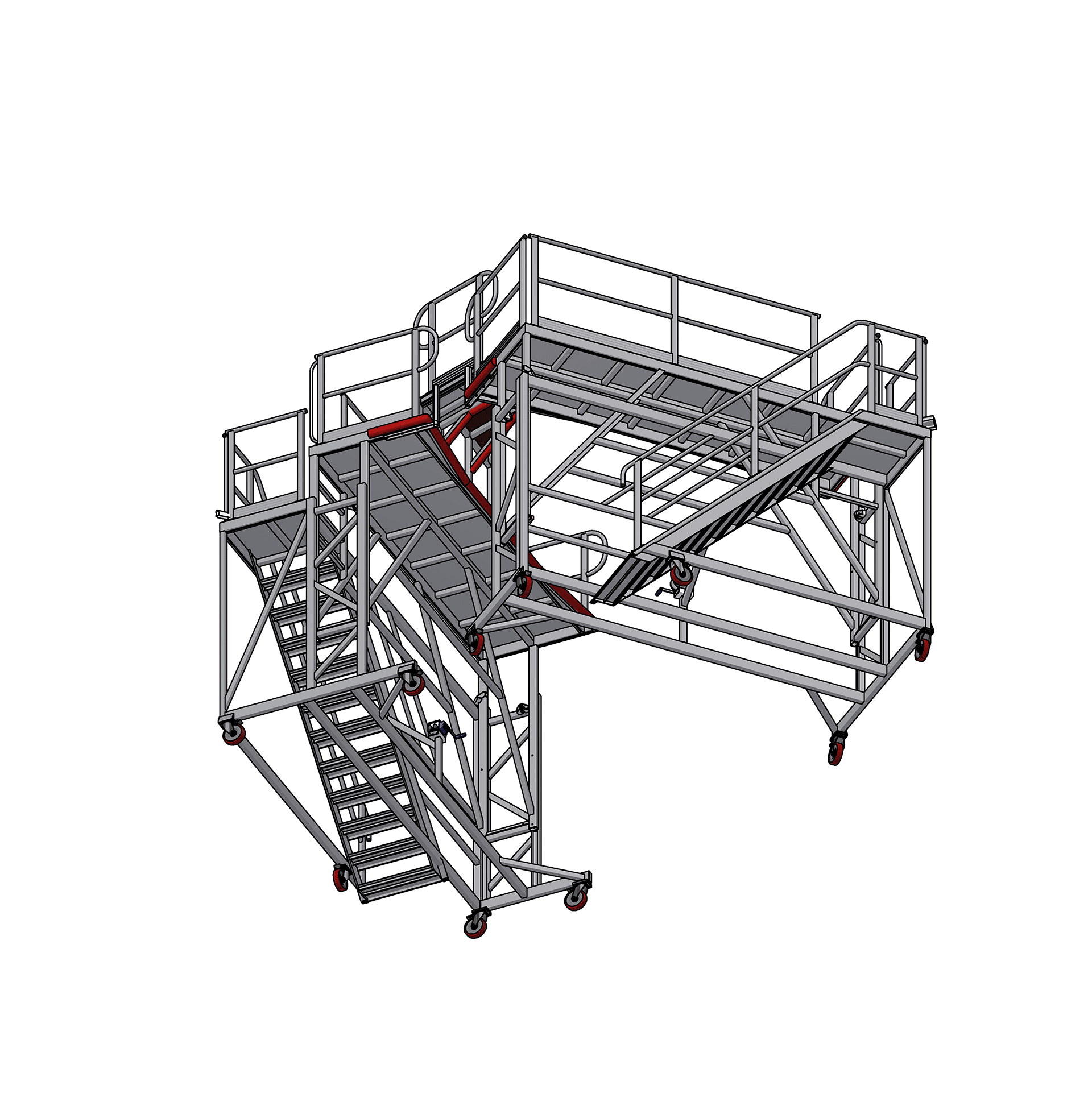 Ease of movement and stability are paramount. The system locks incrementally once the desired height is achieved, guaranteeing a static and reliable working base. Accessing the work level is achieved via a sturdy 45° Stair Access system.