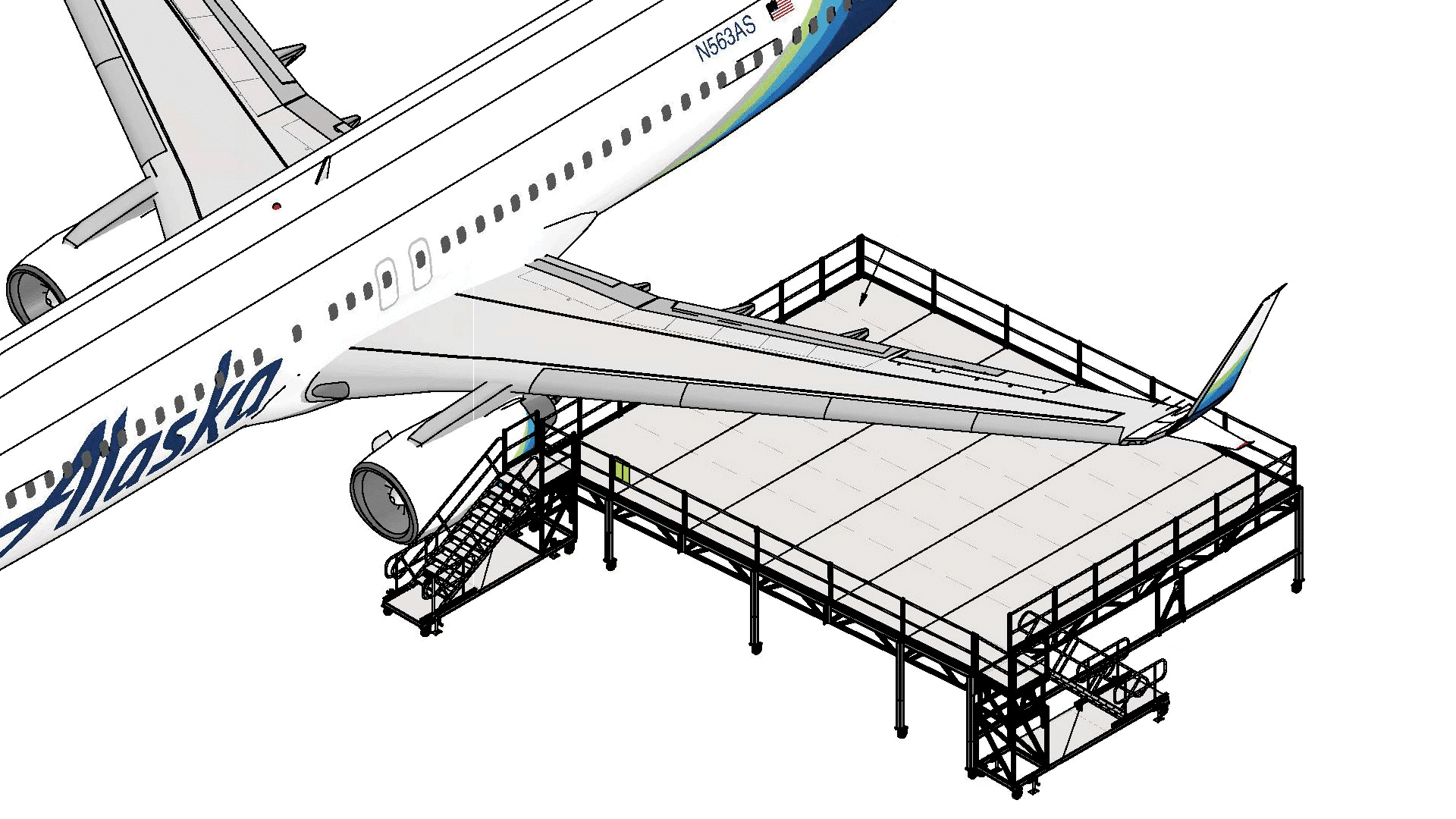 Welded railings with ergonomically rounded edges, along with mandatory handrails and toeboards, maximize worker safety across all working surfaces. Safety is at the heart of everything we do, ensuring crews can perform detailed inspections and extensive repairs efficiently and with the highest degree of safety across the entirety of the aircraft wing.
