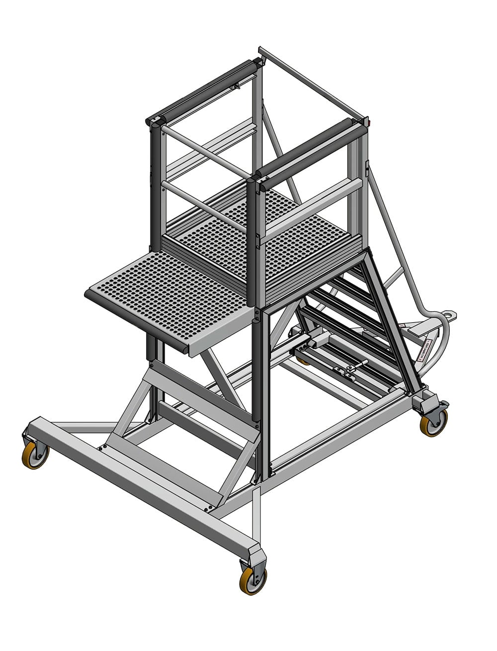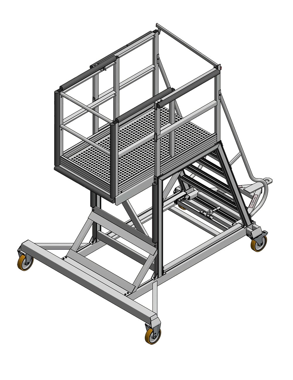 Mobility is a leading aspect of this maintenance solution. The platform is equipped with a combination of heavy-duty castors for precise positioning and stability. It incorporates heavy-duty towable fixed castors, ensuring stable movement in a straight line, as well as heavy-duty towable braked swivel castors.