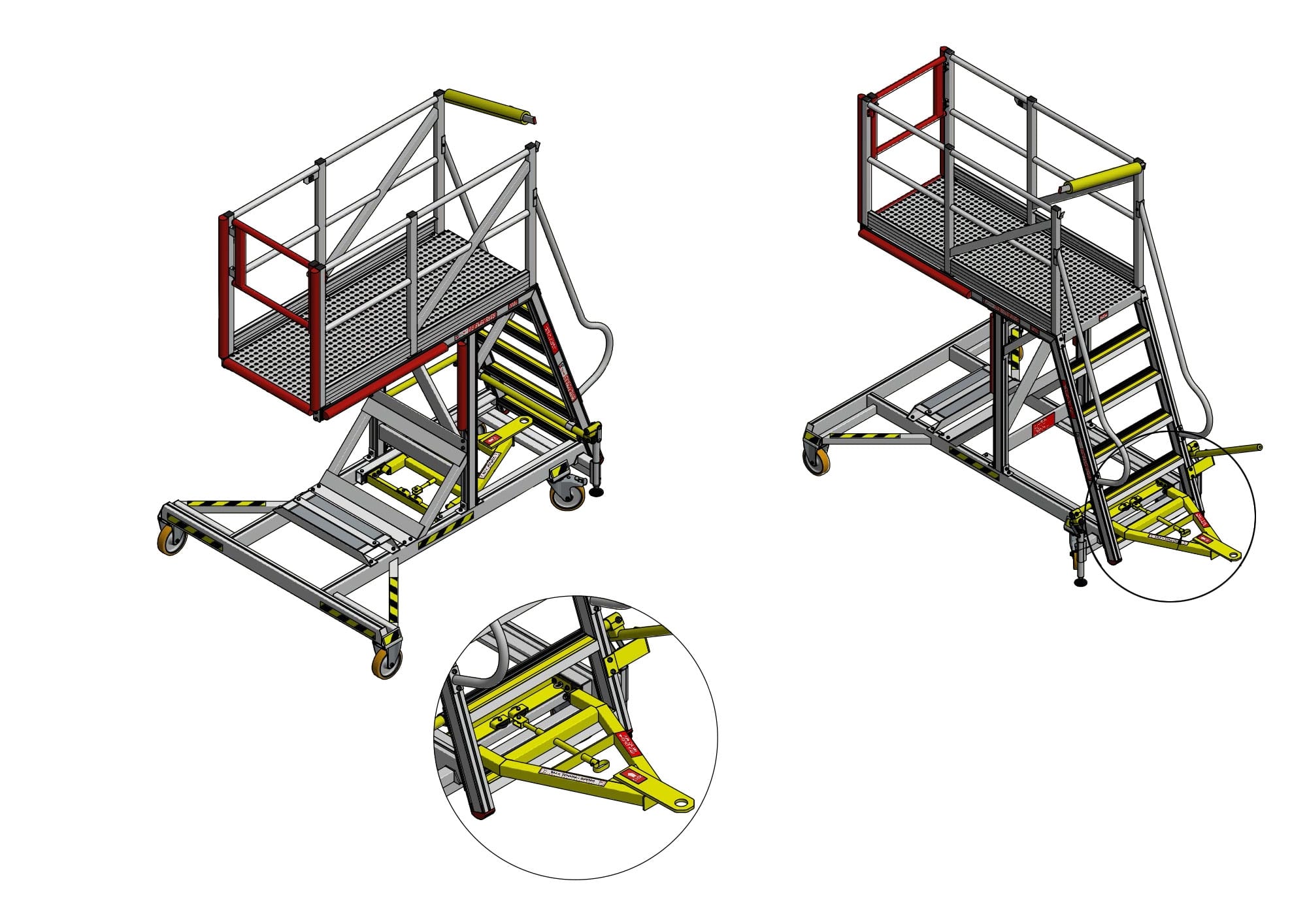 The deck of the platform is constructed using a Perforated Deck design. This feature ensures superior grip, mitigating the risk of slips even in environments where fluids or lubricants might be present. The perforation also prevents water accumulation, making it suitable for use in various weather conditions within hangar or apron environments. This attention to detail in material and construction underlines our commitment to maintaining a safe and reliable workspace.