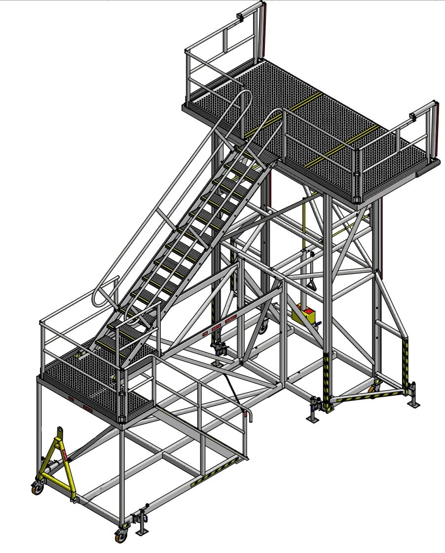 The spring-loaded handrail system is shaped to follow the aircraft’s contours. This helps reduce gaps between the B787 Entry Door Access Stairs and fuselage, creating a smooth transition for users entering or exiting the aircraft. It also supports safety during maintenance tasks at the doorway, such as checking emergency slide fittings, servicing door mechanisms or transferring equipment into the cabin.