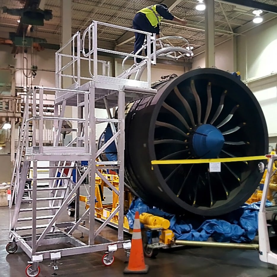 With the engines being detached during maintenance, and standing at 115 inches from the ground up, workers found it challenging to reach the center top of the engine without having to overreach. They commissioned SafeSmart Aviation to design these curved access stairs, which are easily rolled up to each side of the engine and secured into place by lockable castors.