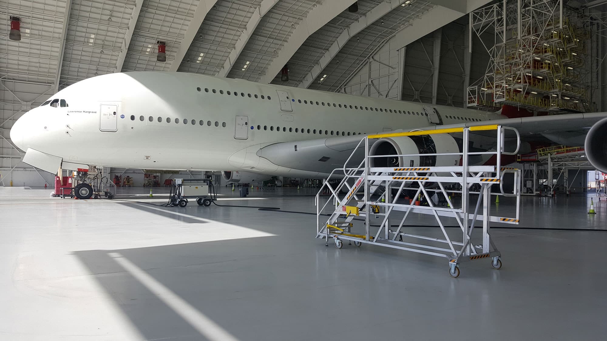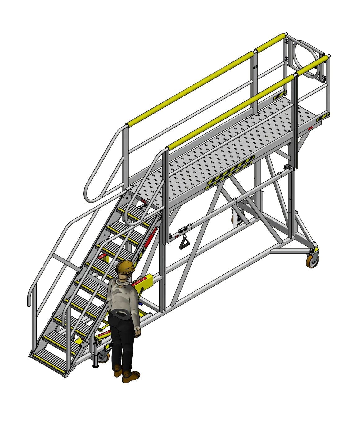 To protect the aircraft from accidental damage, the top handrail is fitted with a vinyl-covered foam buffer. This attention to detail reflects a comprehensive approach to aircraft asset protection, ensuring the necessary access for maintenance is achieved without compromising the aircraft’s delicate surfaces.