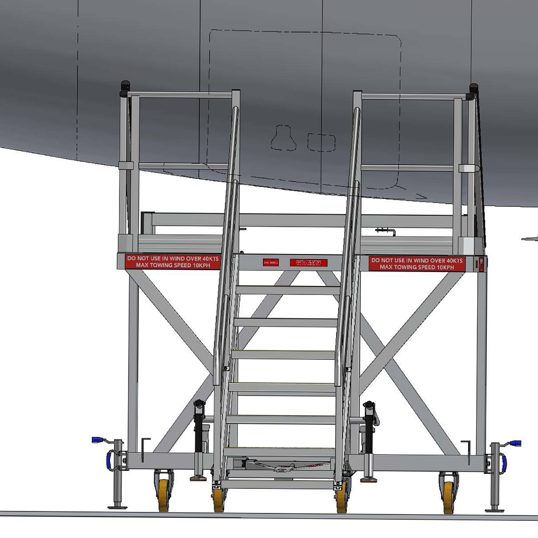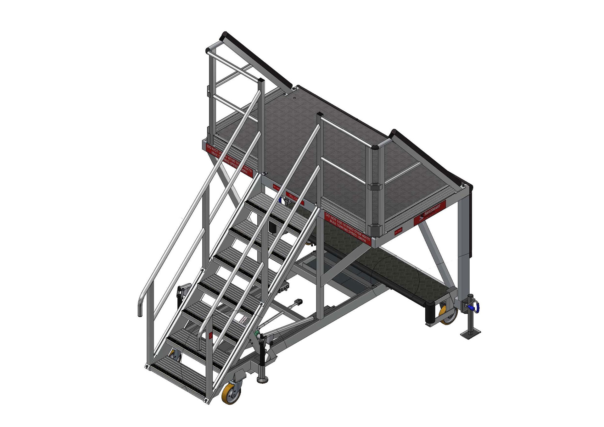 Provides suitable access and edge protection for both the forward and aft Cargo Doors on the E190 E2 aircraft. With a removeable step on the leading edge covering the difference in sill heights. With sloping guardrails, this allows positioning against the aircraft minimizing gaps, along with foam buffering on the leading edges to protect the aircraft during use. Options include tow kits, allowing ease of maneuvering across flight line environments.