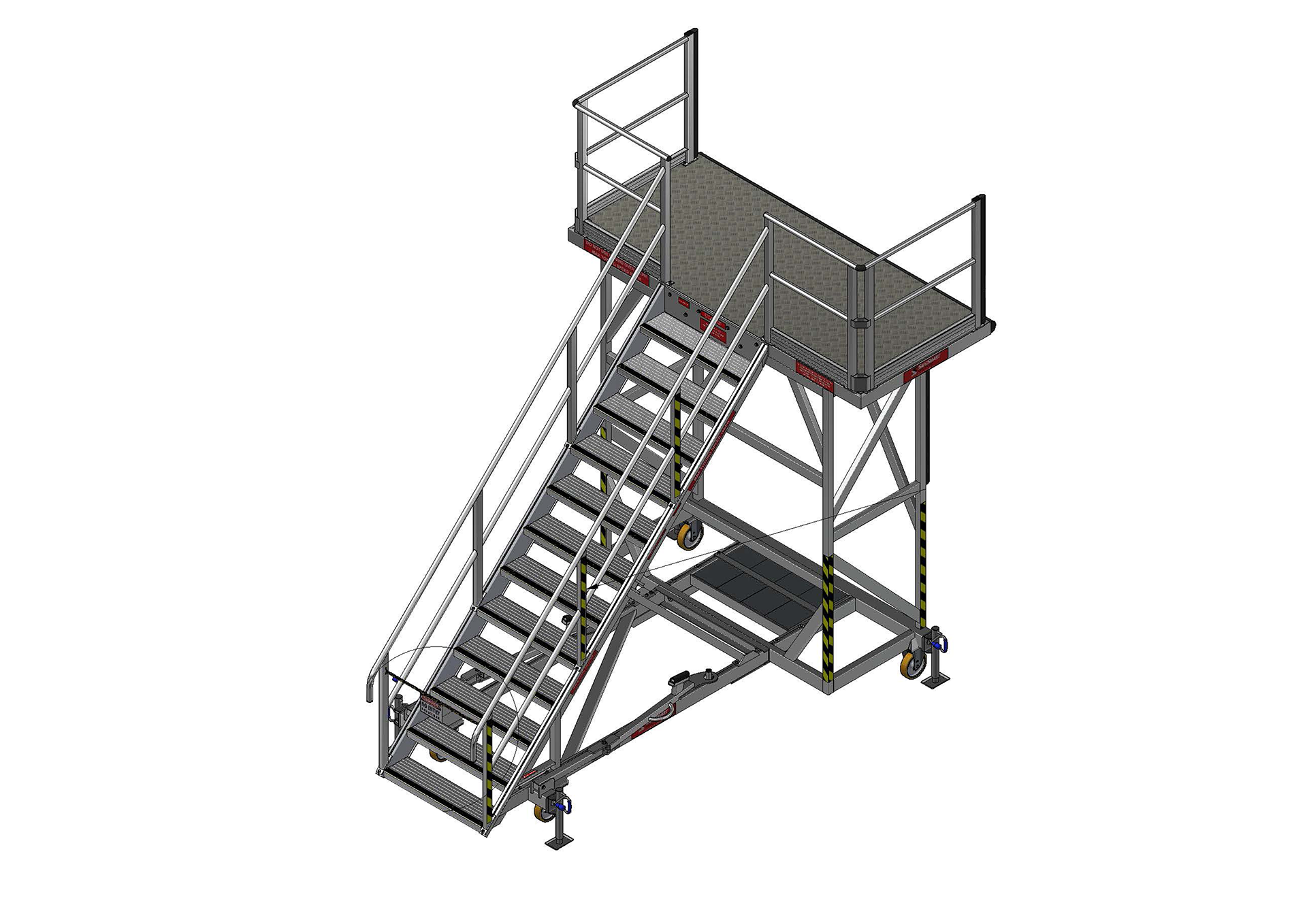 A large platform area allows the opening of the E190 E2 main entry door onto the platform, with no realignment of the platform required, ensuring the user operates from a fully edge protected workspace when accessing the aircraft. Stair access allows the user to keep their hands free when transiting to and from the aircraft, allowing them to carry tools, or parts, or technology when carrying out work and assessments on the aircraft. With an optional SafeWrap tow kit design, that allows for a simple set up and stowing of the tow bar in seconds, facilitating fast deployment and ease of maneouvering across flight line environments.