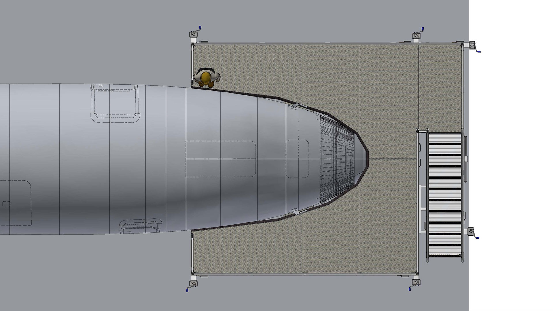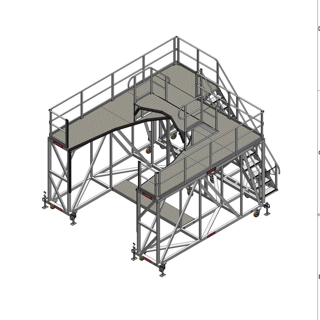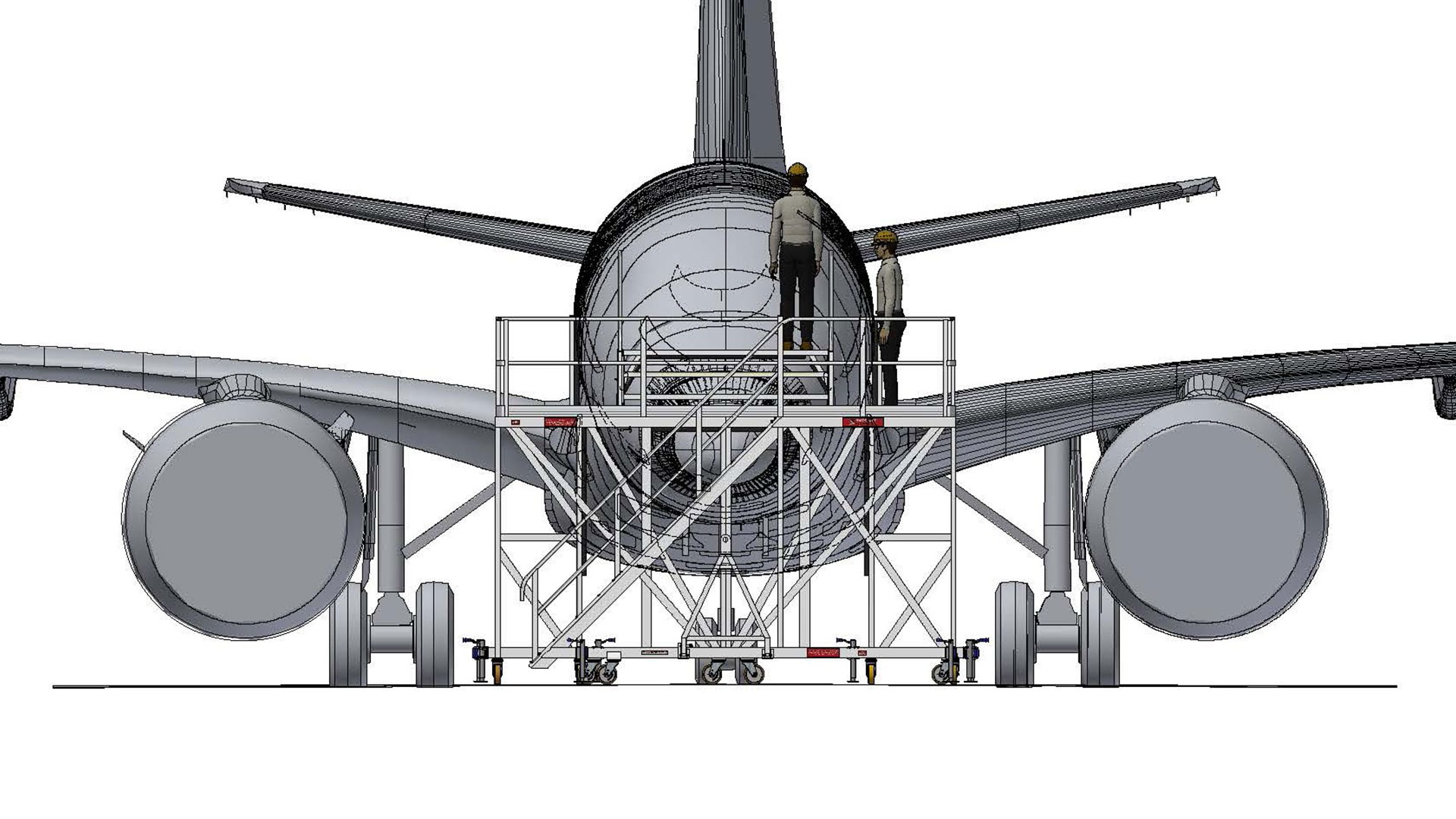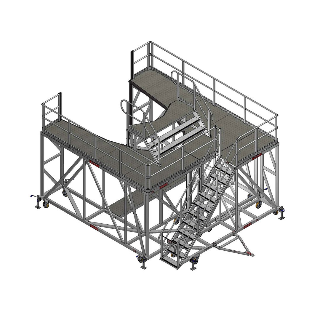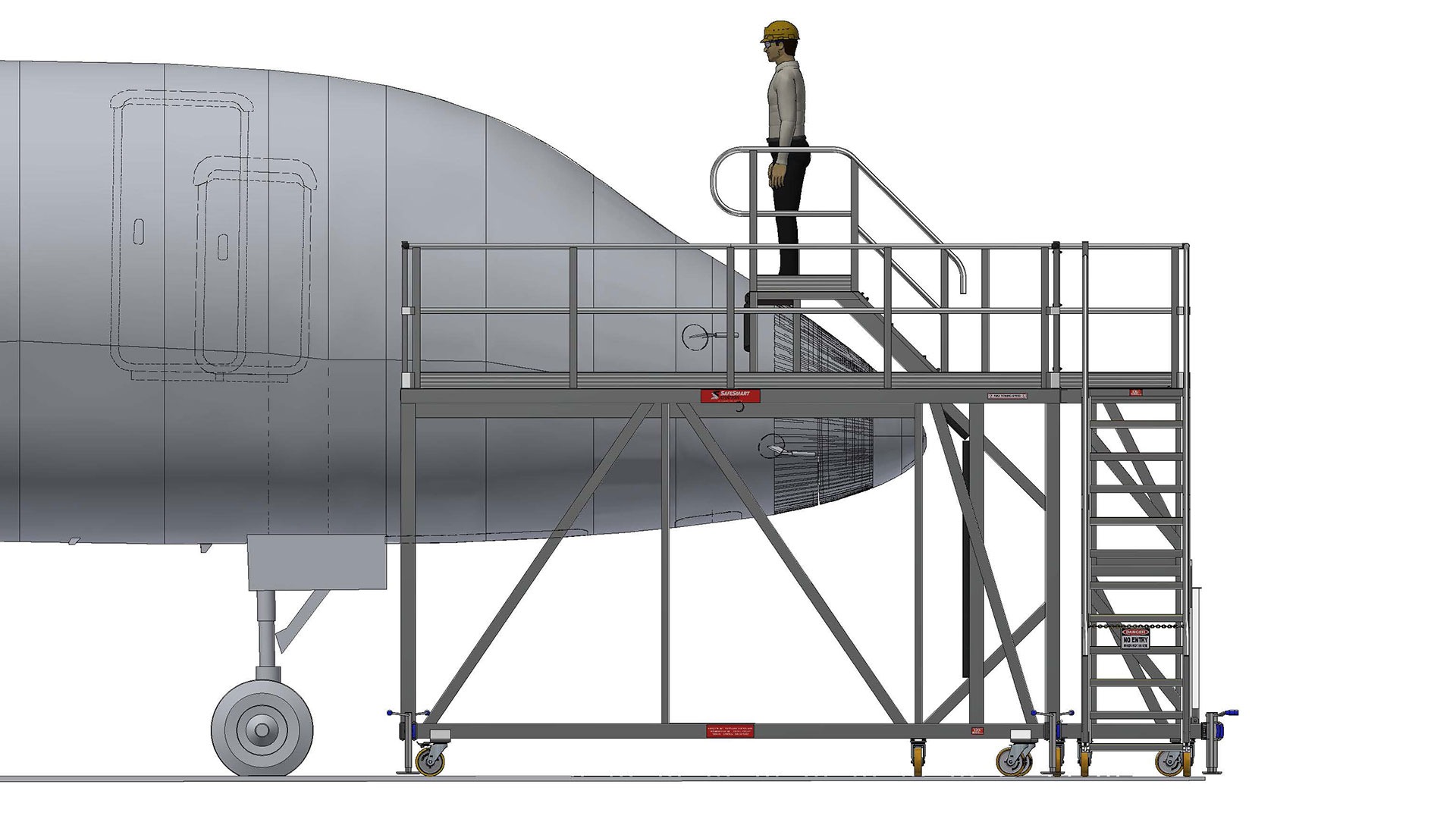Large work area provides access to the entire windscreen of the aircraft for repair and replacement work. A stair angle of access allows the user to access the work area while carrying tools and parts required. A removable step up can be positioned centrally, providing reach over the nose of the aircraft and ease of access to the workspace. Available with tow kit options, allowing use in either hangar or flight line environments, and ease of maneuverability over long distances. Constructed with marine grade aluminium ensures longevity and durability when stored outside hangar environments.