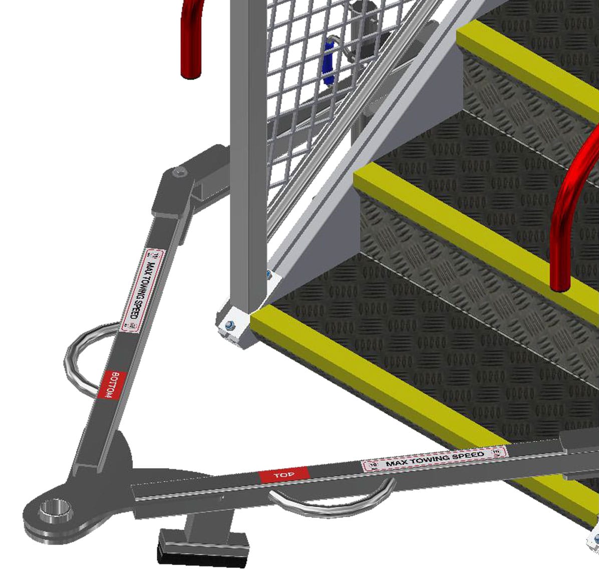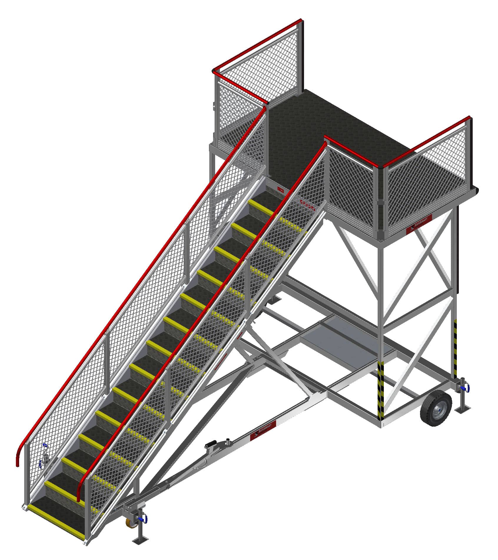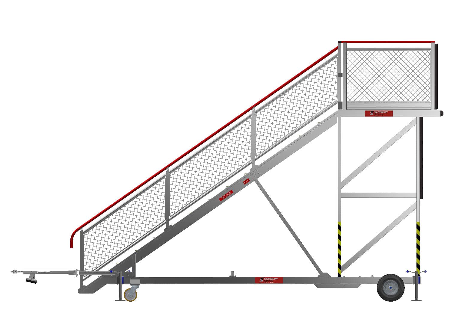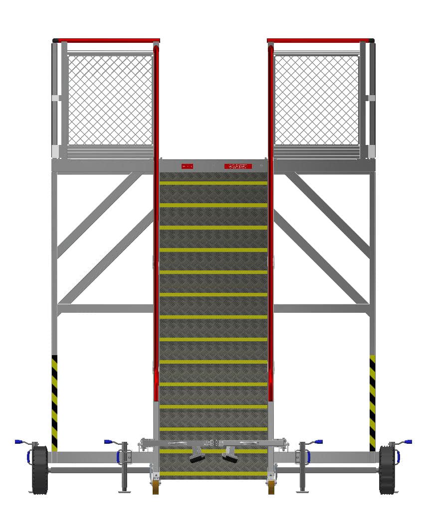 Fully compliant with public passenger boarding access requirements under the NCC. Includes solid rubber wheels, ensuring no risk of downtime due to punctures, and providing a cushion when transiting across the tarmac. The SafeWrap wrap-around tow bar ensures that the structure is entirely clear for the passenger, and makes it simple to deploy when towing is required. The enclosed treads with fibreglass nosing, continuous handrail, and mesh infill on the guardrail frame ensure safe ascent and descent by the passengers on the stairs.