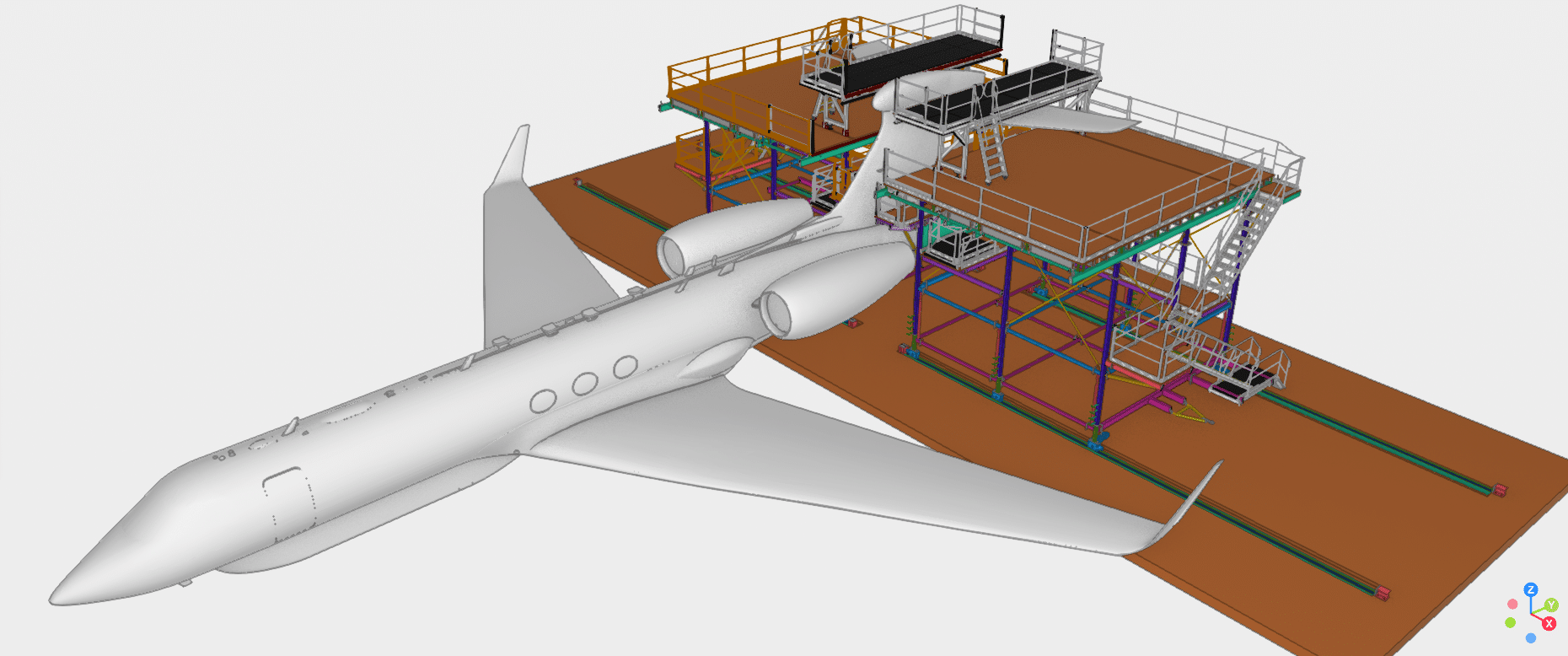 The Gulfstream G550 Tail Docking System is a portable, multi-level access structure designed to support detailed inspections, component changes, and structural work across the entire tail section of the G550 airframe. Built around a large footprint—8.92m wide, 8.814m long and 8.09m high—it delivers a stable, fully serviced work zone that allows technicians to reach every surface of the vertical stabiliser, horizontal stabiliser, tailcone, APU bay, and associated systems with confidence and precision.