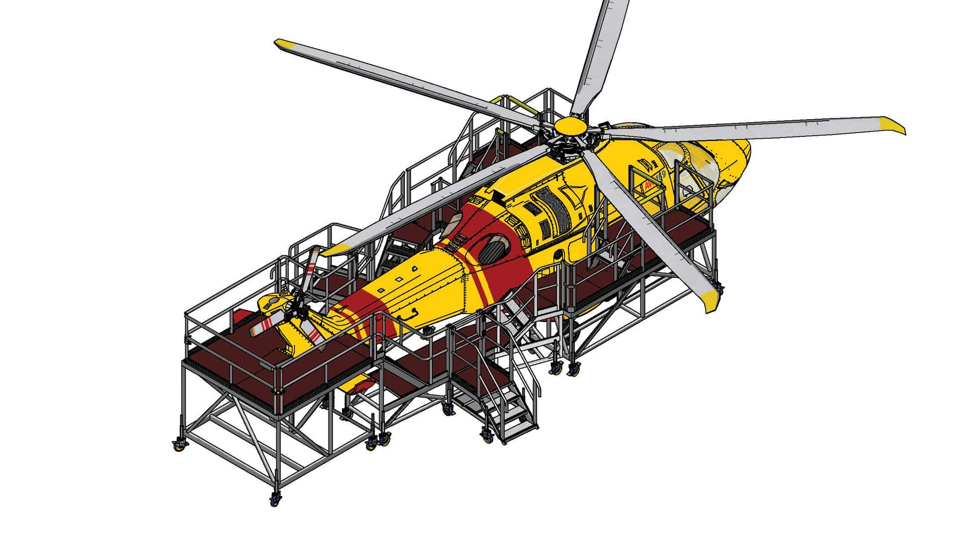 The overall design is complemented by the Mobile Dock Access Platform, a flexible unit that can be positioned anywhere around the aircraft to fill gaps or provide supplementary access, ensuring comprehensive 360° coverage. When all modules are deployed, the system creates a contoured stand that completely surrounds the helicopter, eliminating unauthorized access routes and enhancing safety during all phases of maintenance. For alternative solutions, consider our specialized single-level platforms for the AW169.