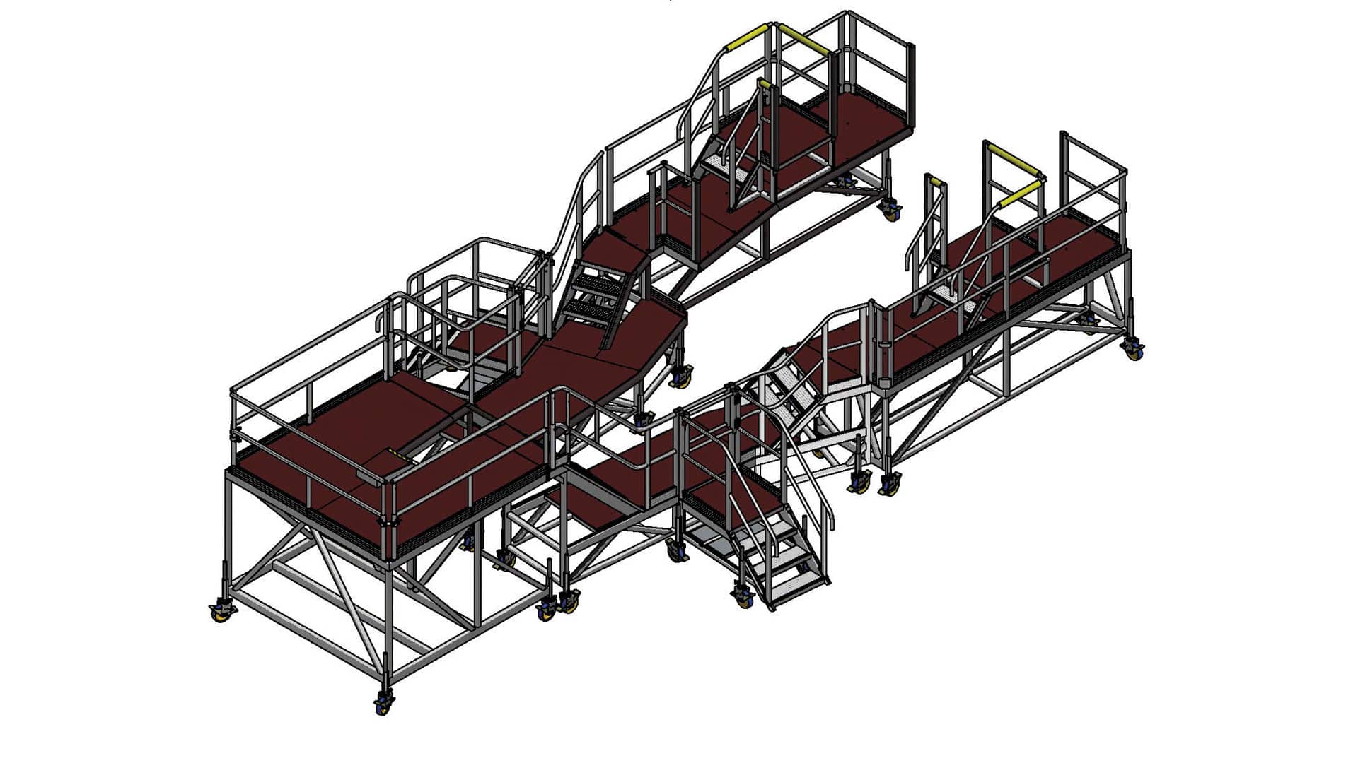 Operational flexibility and ease of deployment are central to this AW169 Helicopter Docking System. The entire docking structure consists of independently mobile modules. This mobility facilitates rapid pack-down for compact storage when not needed and swift, efficient deployment for maintenance cycles. We focus on what works, ensuring your team is safe and productive faster. The system incorporates several specialized platforms, each designed methodically to address specific access challenges of the AW169’s unique architecture.
