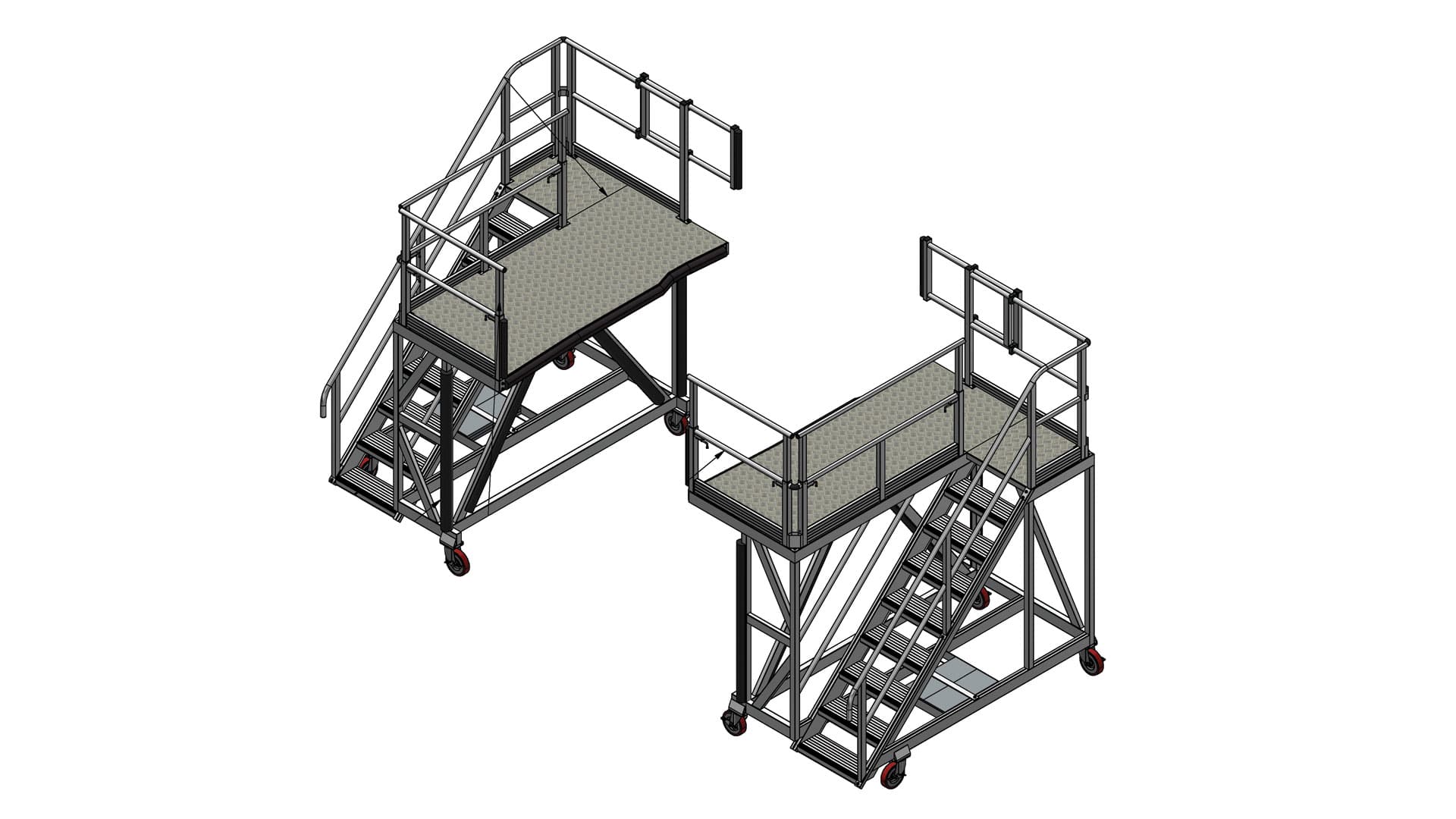 The AW169 Single Level Side Platform incorporates innovative telescopic guardrails that slide forward, closing any fall risk gaps near the aircraft. Drop-down guardrails offer flexibility for specific maintenance tasks on the side fuselage. Leading edges are equipped with foam rubber composite buffering, protecting both personnel and the aircraft from accidental damage. Anti-slip nosing on walking surfaces ensures secure footing under demanding workshop conditions.