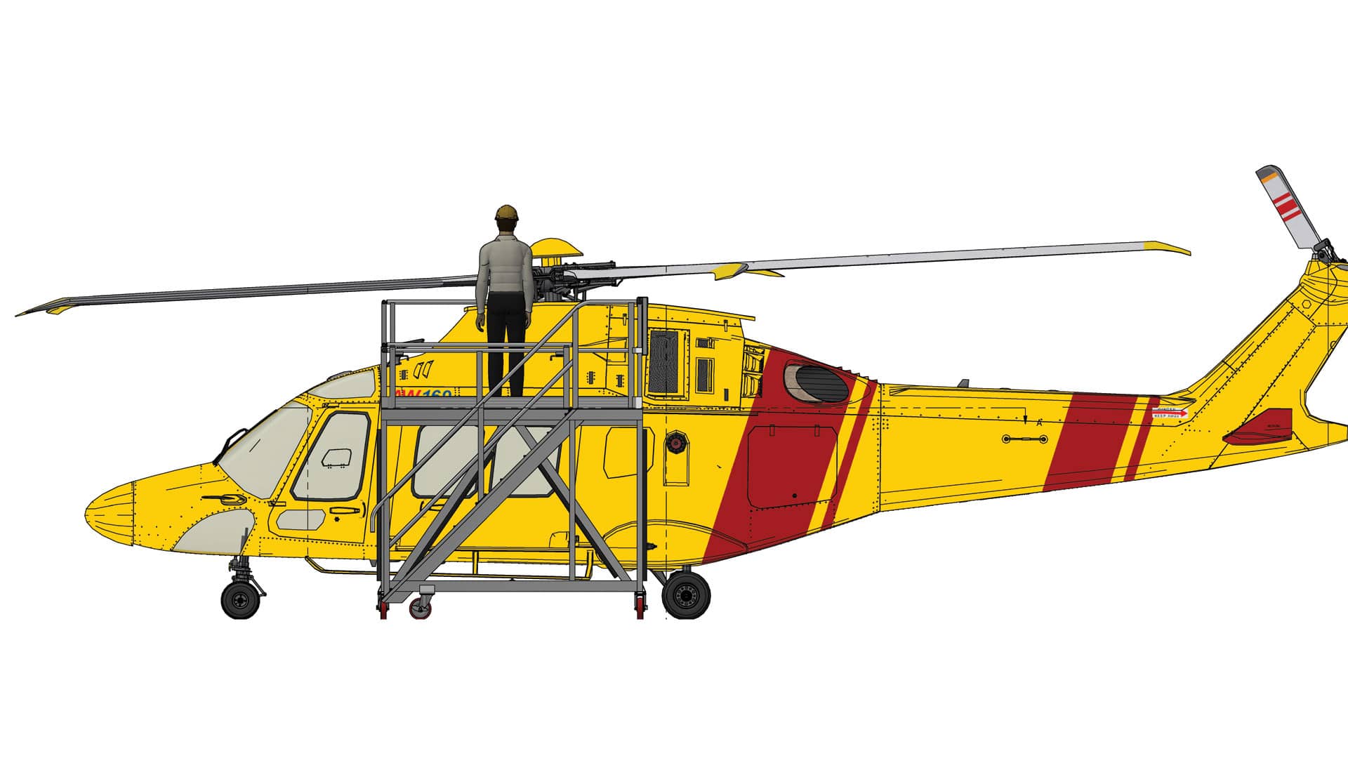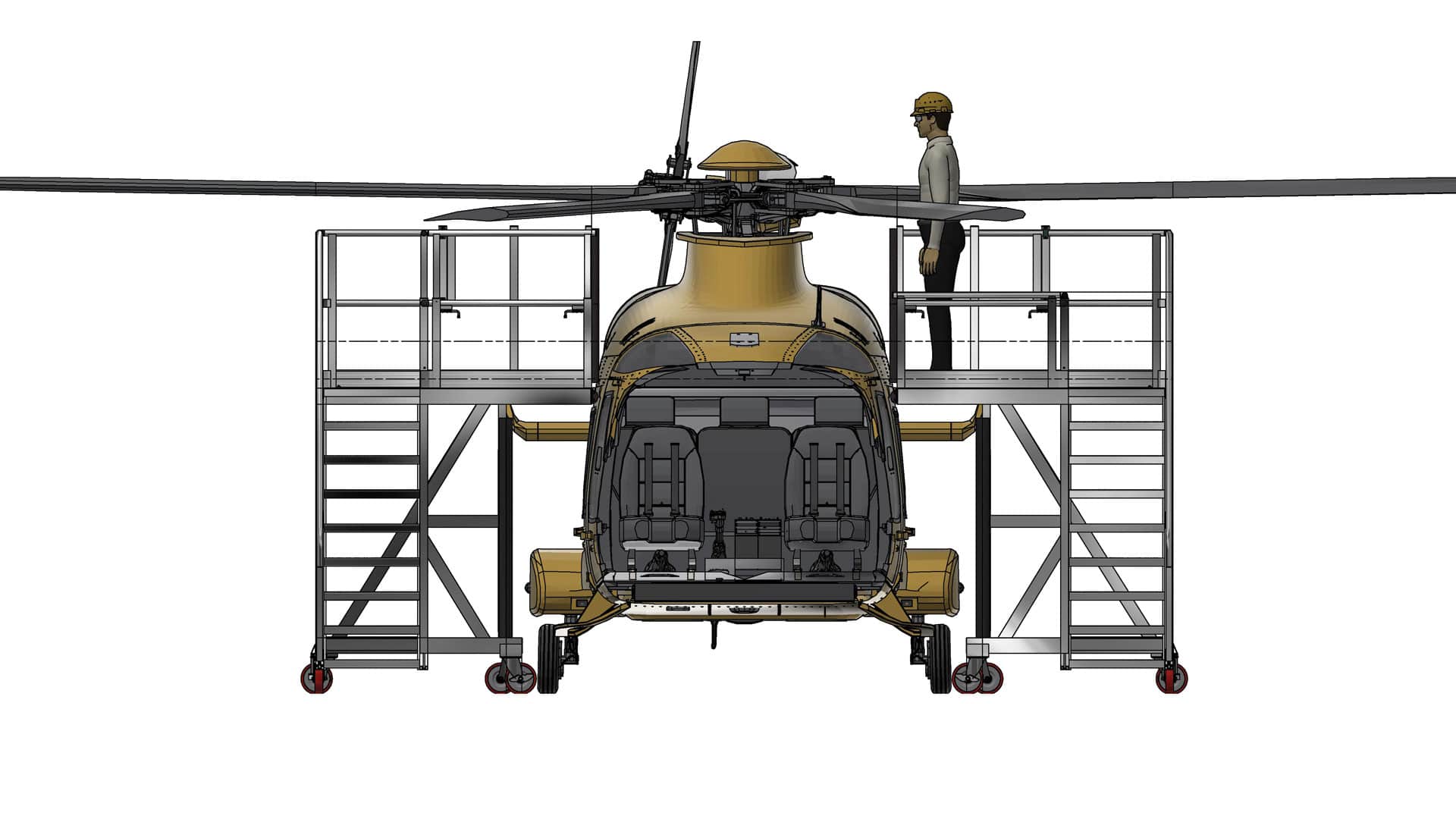 Since the AW169 features engines and the gearbox on top of the fuselage, this single-level unit ensures technicians safely reach these elevated areas (approx. 2 to 2.5 meters high). It is particularly valuable for accessing the RH Side Engine area, facilitating quick and secure inspection and maintenance tasks. It also assists in maintenance required around the canted tail rotor.