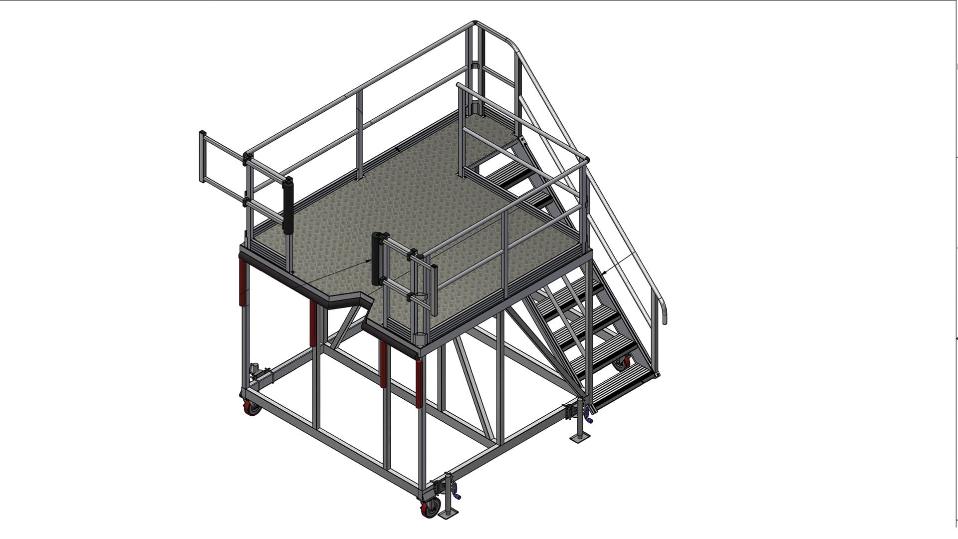 Access to the working deck is facilitated by sturdy stair access, designed to allow users to comfortably carry necessary tools and parts, optimizing the flow and efficiency of maintenance tasks. Once on the AW169 Tail Access Platform, technicians benefit from a secure, stable environment defined by essential safety components: telescopic guardrails provide perimeter protection, while anti-slip stair nosing and high-grip tread plate decking ensure secure footing in all workshop environments. Stability is further assured by wind-down jacks, which allow for precise leveling and firm anchoring of the stand.
