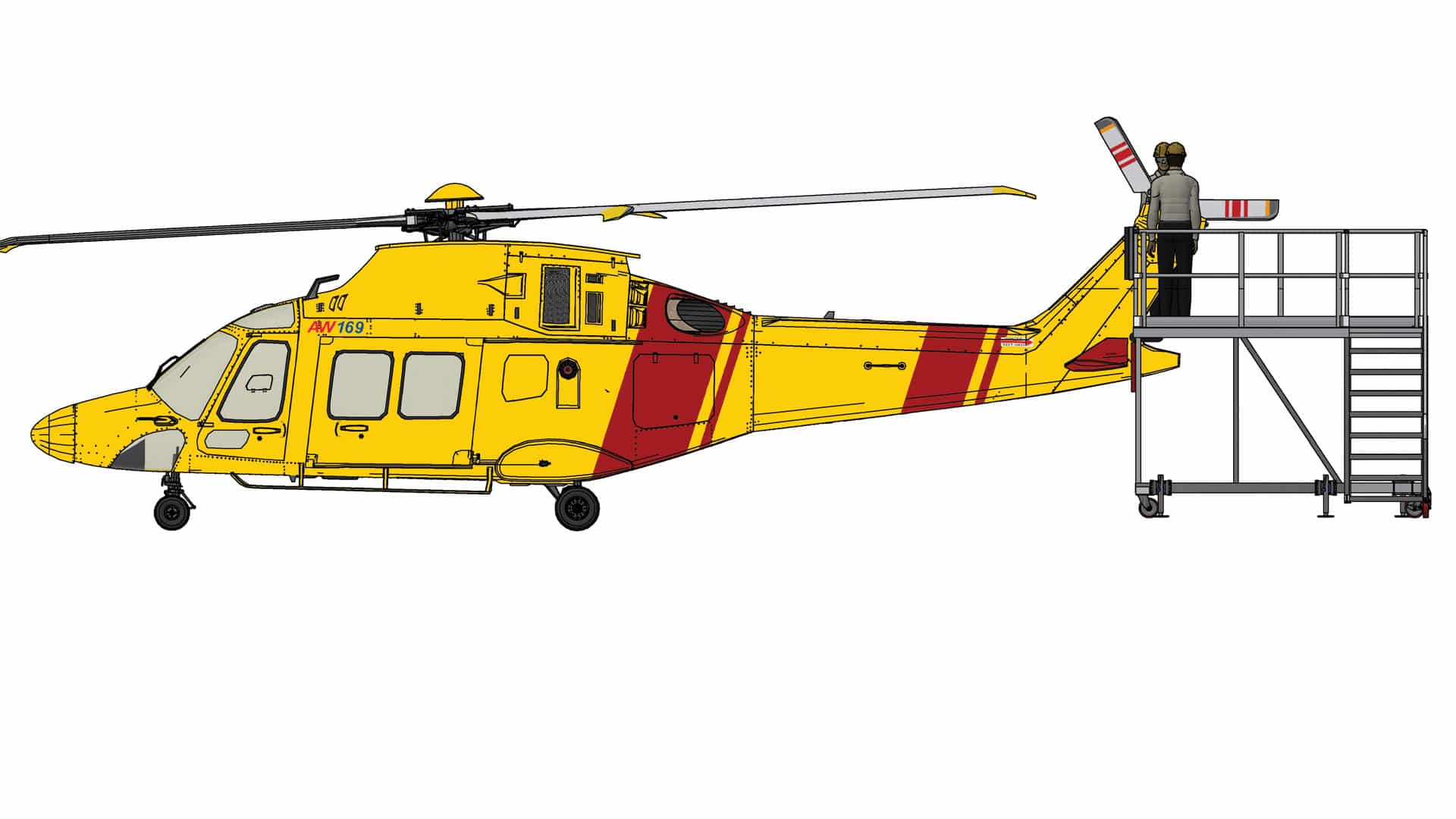 For the Leonardo AW169, this AW169 Tail Access Platform is indispensable for accessing maintenance areas that include the canted tail rotor assembly, where specific side access is required for inspection and servicing. It provides the necessary height and reach for routine inspection of the tail rotor driveshaft, which is subject to canted load stress. Furthermore, the complete access provided to the tail and tail rotor enables thorough routine checks and maintenance procedures, crucial for airworthiness and operational readiness.