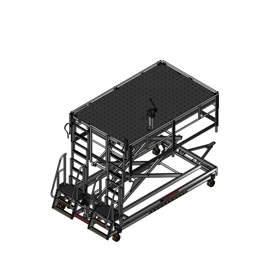 Safety and efficiency are paramount to the design. The platform incorporates high-strength, durable construction materials and features perforated and swaged decking to allow moisture to pass through. Non-slip rubber matting covers the decking for superior grip and hazard mitigation. All components are retained, a critical design element that prevents Foreign Object Debris (FOD) hazards in the maintenance environment.