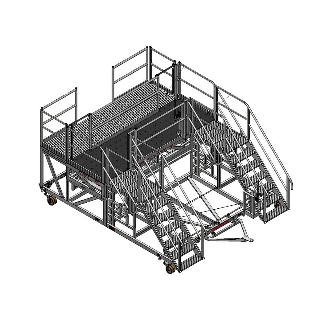 Safety and operator comfort are paramount in the platform’s design. It maintains a consistent 45-degree stair access to the adjustable platform, regardless of the height setting. This constant angle provides a secure and natural ascent/descent path, a vital feature when carrying tools or components. Access to the fixed, lower front section of the platform is facilitated by integral vertical access ladders. The deck surfacing itself is a high-performance system: perforated and swaged decking material is overlaid with durable rubber matting. This combination allows any moisture to drain effectively through flush perforations while the rubber provides superior anti-slip grip, indispensable in a maintenance environment where oils or fluids may be present.