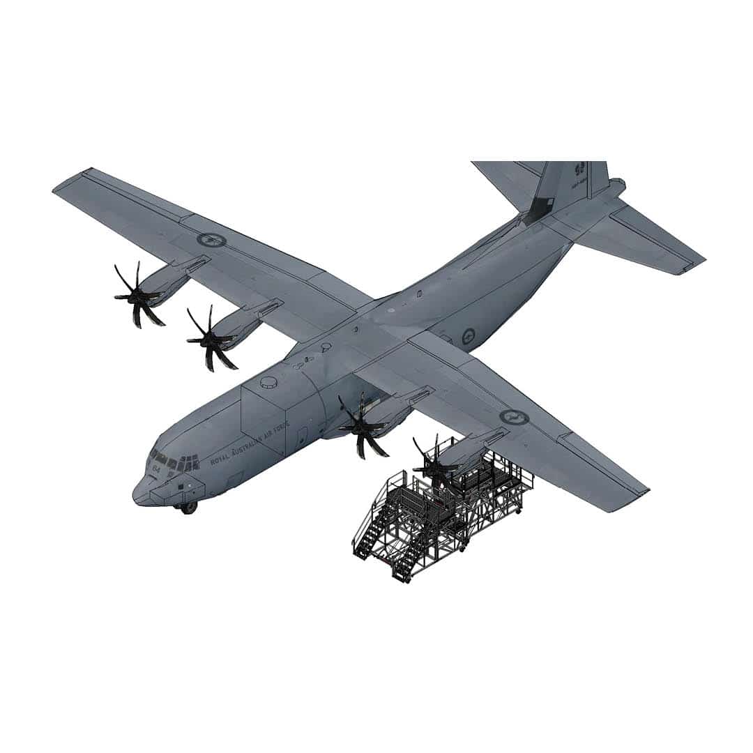 For logistical flexibility, the entire stand is deployable within a C-130 aircraft, breaking down into three main modules for easy stowage and deployment. All indispensable components, such as pins and securing parts, are retained with lanyards to prevent FOD (Foreign Object Debris) incidents. With a substantial SWL (Safe Working Load) of 1000kg, this platform is built to safely support personnel, tools, and replacement components necessary for demanding C-130 propeller maintenance. Its dimensions are 2.09mL x 3.71mW x 1.489 – 2.572mH, confirming it is suitably sized for the targeted maintenance access.