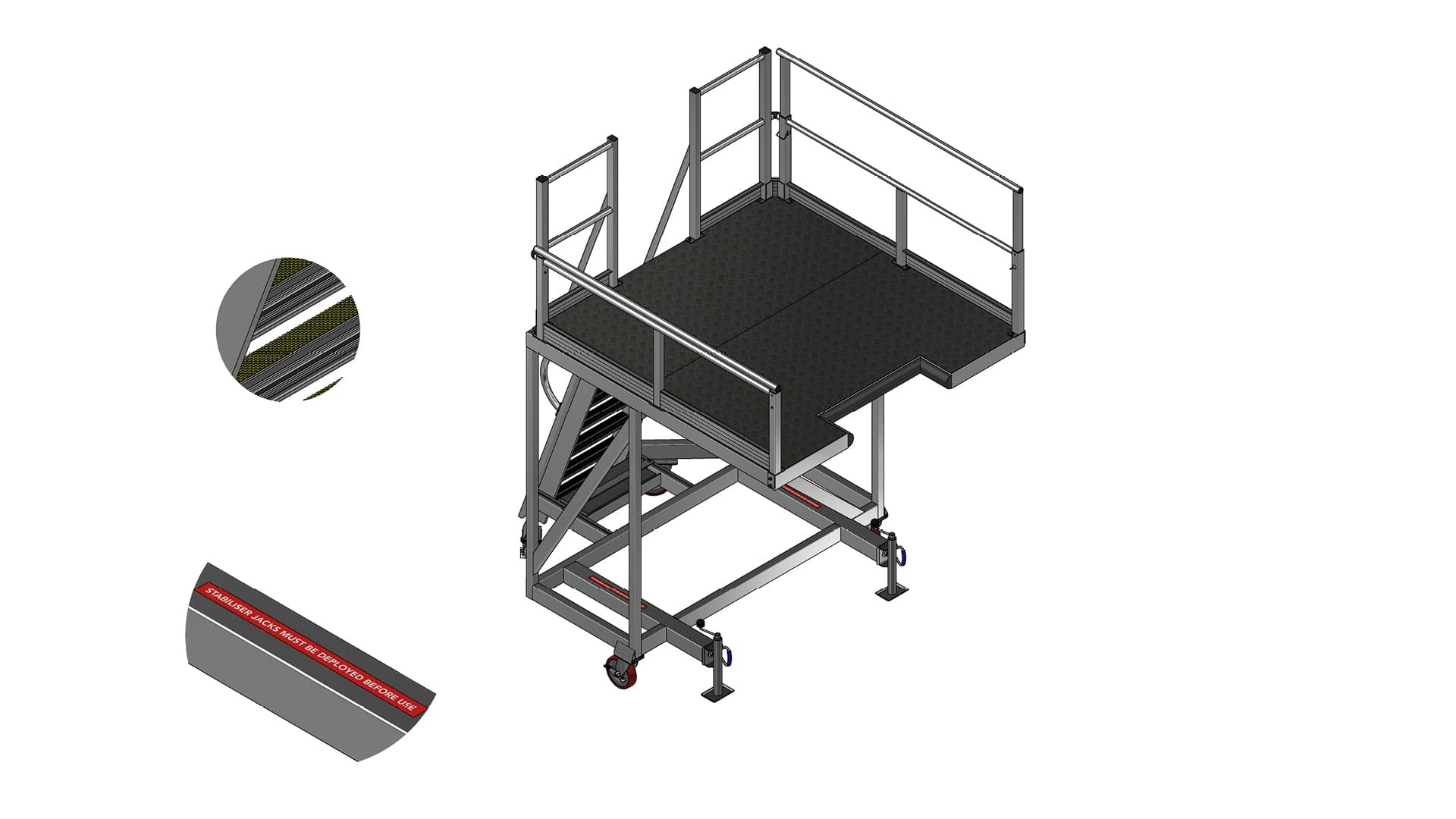 Safety and aircraft protection are paramount in this design. The large working deck is surfaced with hard-wearing treadplate decking, complemented by anti-skid nosing for enhanced footing security. For technician safety, telescopic handrails are installed on the sides of the platform.