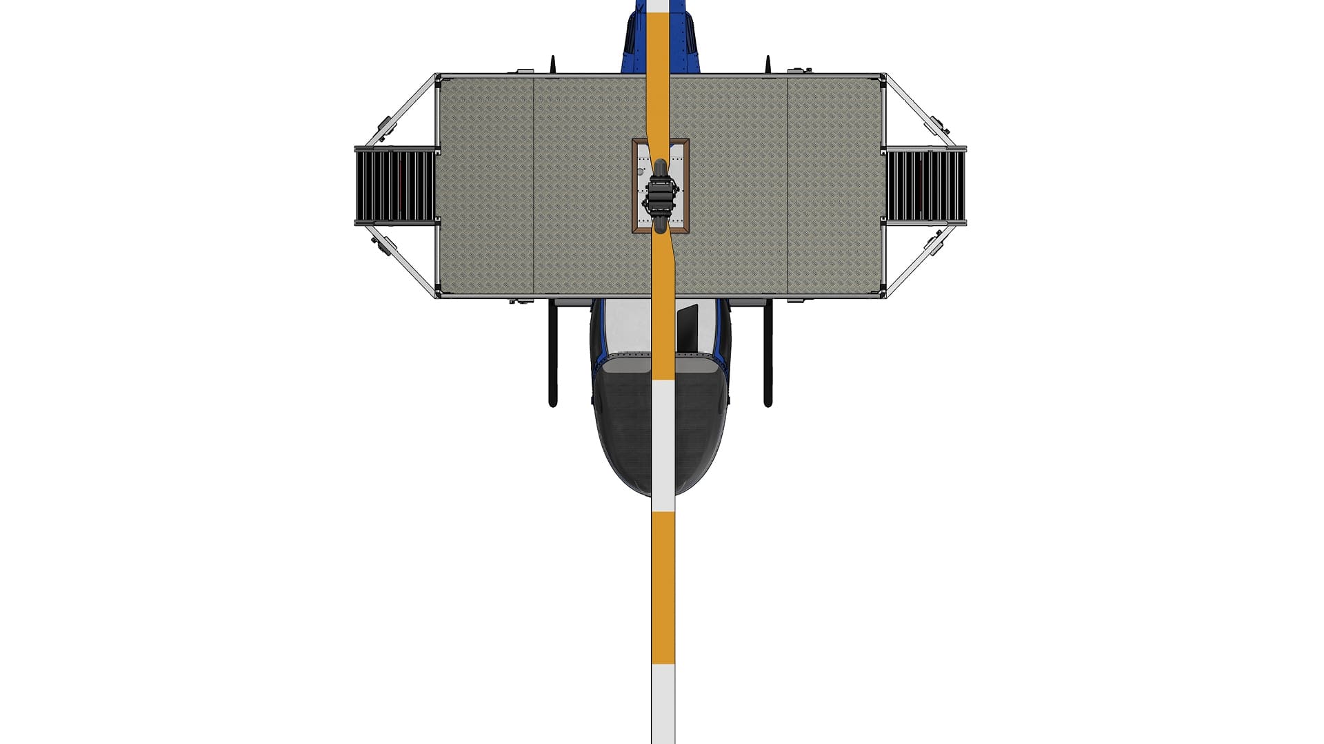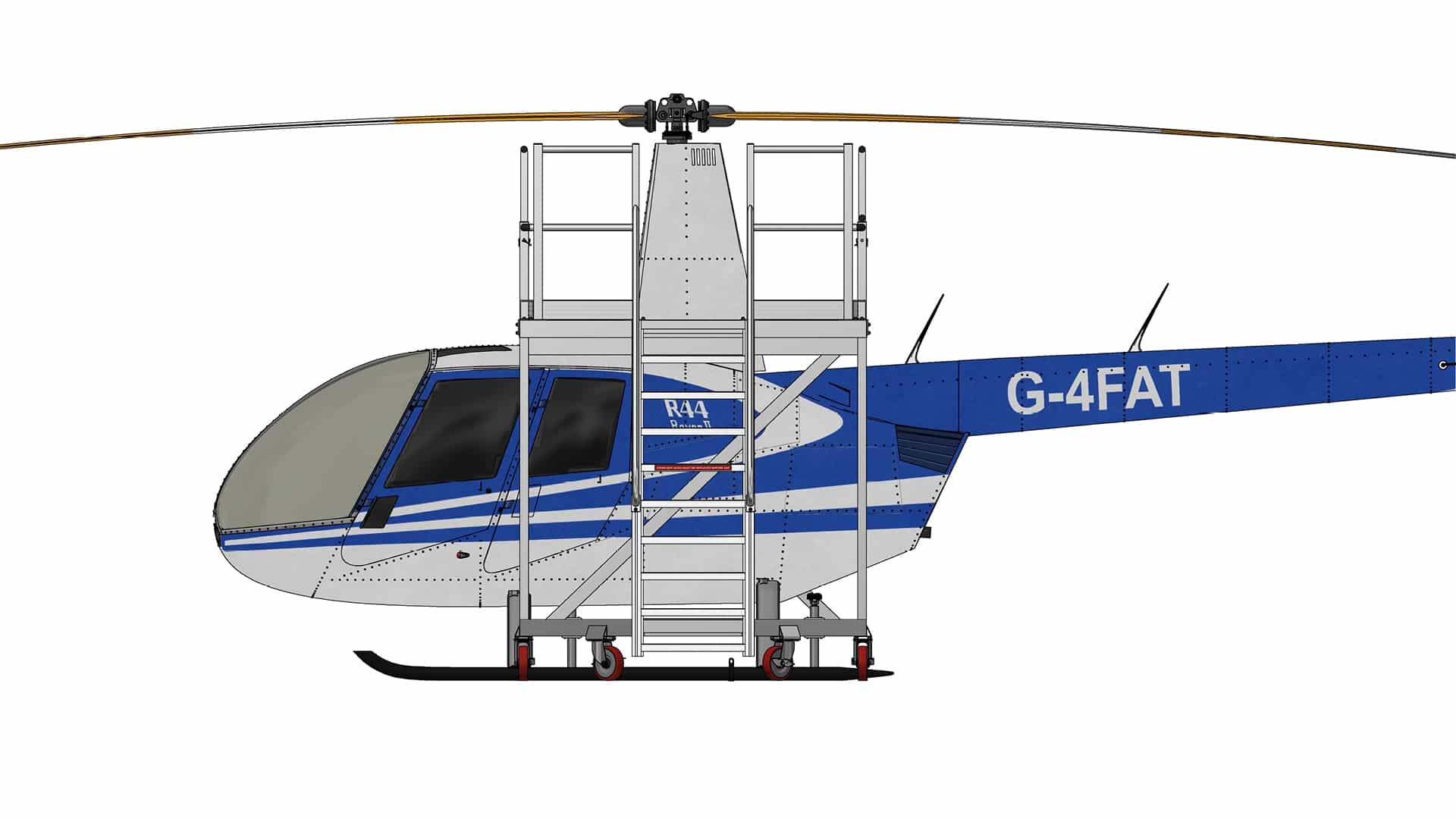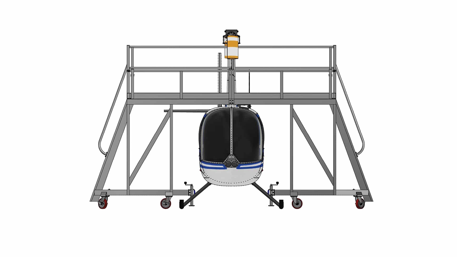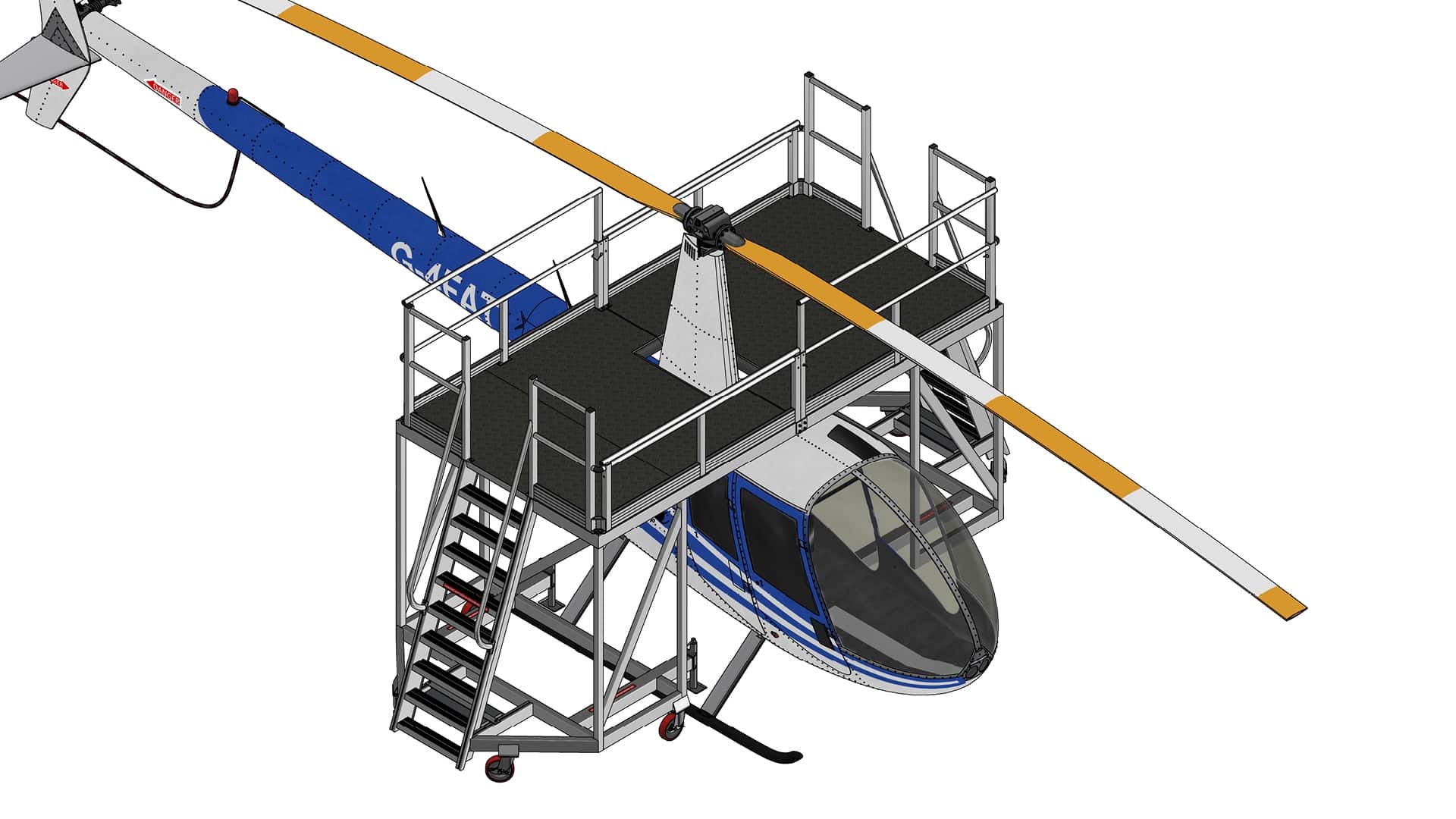 The platform set is engineered to provide completely unimpeded access, addressing the unique challenges presented by these popular light aircraft. Innovative features include a clear overhang, which extends over the aircraft skids and airframe. This cantilevered structure ensures that technicians can position the platforms precisely and move them around the aircraft at will, maximizing accessibility without obstruction. Counterweights are integrated as required to ensure stability and clearance over the helicopter skids.